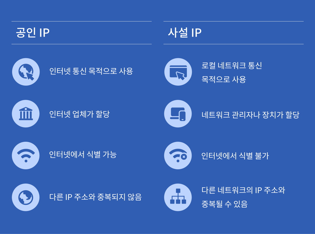 IP 주소에는 공인 IP 주소, 사설 IP 주소, 동적 IP 주소, 정적 IP 주소 등 다양한 유형이 존재한다.