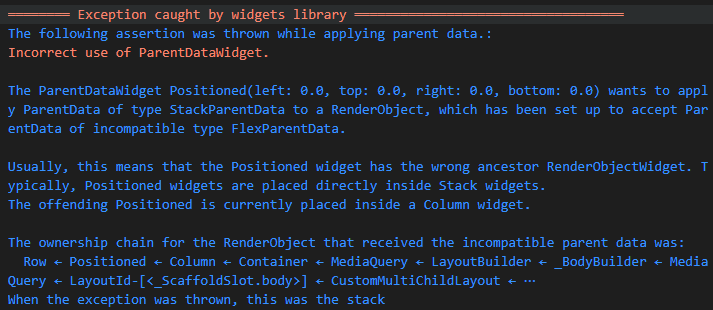 The ParentDataWidget Positioned(left: 0.0, top: 0.0, right: 0.0, bottom: 0.0) wants to apply ParentData of type StackParentData to a RenderObject, which has been set up to accept ParentData of incompatible type FlexParentData.