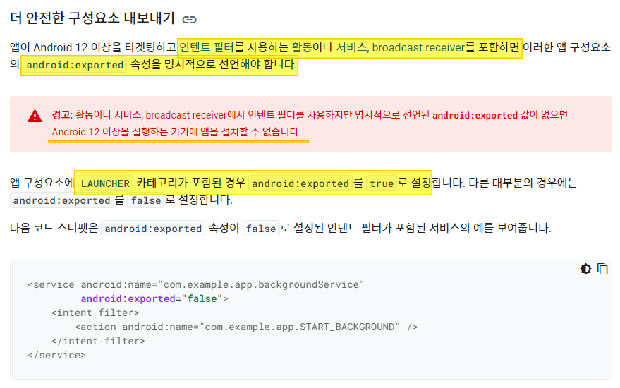 이전 버전에서는 default값인 true가 자동이지만 Android 12 부터는 명시적으로 적어줘야한다.
