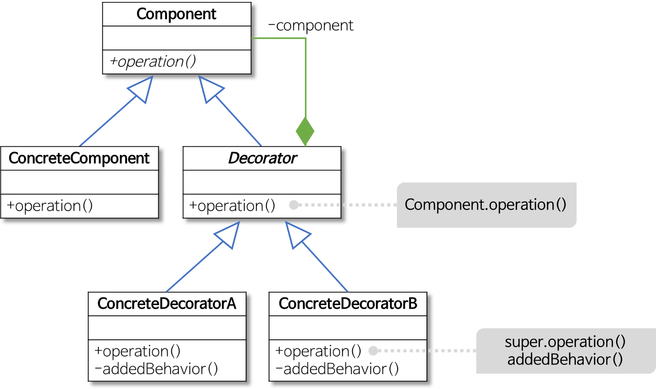 주어진 상황 및 용도에 따라 어떤 객체에 책임을 덧붙이는 패턴으로, 기능 확장이 필요할 때 서브클래싱 대신 쓸 수 있는 유연한 대안이 될 수 있다.